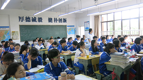 短暂的交流后,交流团一行一起走进教室认真听了我校九位老师九门学科的课,亲身感受我校“双模”教学的魅力。老师们充分展示了其新先进的教学理念、扎实的基本功和朝气蓬勃的活力课堂,获得了交流团同行们的一致认可和称赞。课后,交流团的老师们与任课教师进行了深入的探讨和交流。
