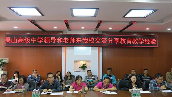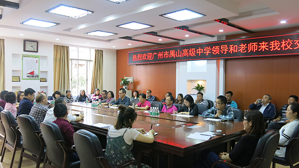 5月4日下午,广州市禺山中学一行26人来我校参观学习。我校校长黄佳、副校长张桂元、办公室主任周合云、教育处主任肖永贵、办公副副主任杨鑫接待了远道而来的同行们。交流活动由周合云主任主持。