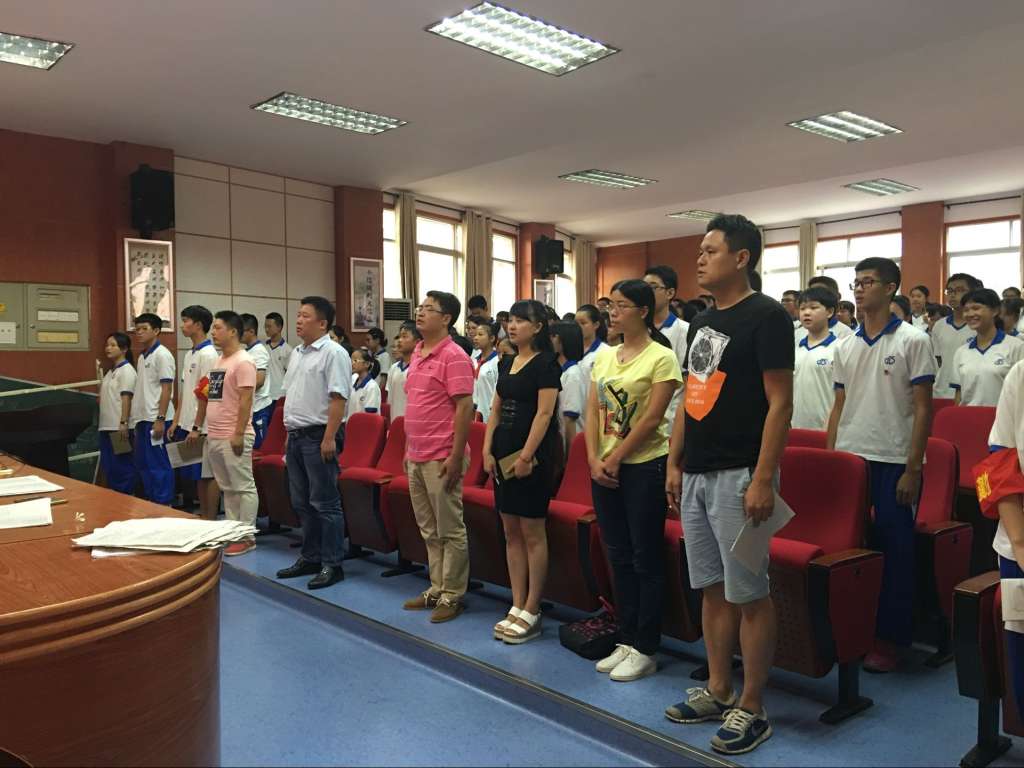 大会在庄严的国歌声中开始。全体师生起立,齐唱国歌。