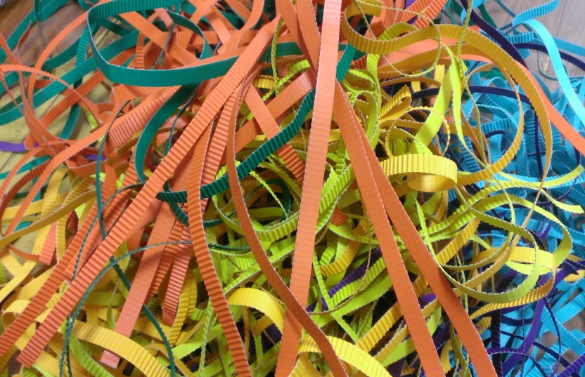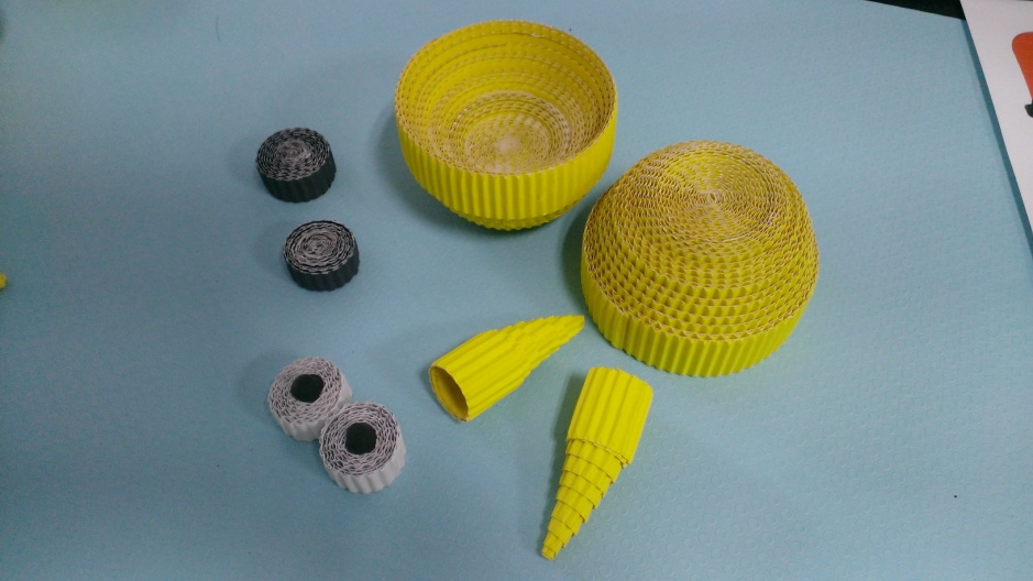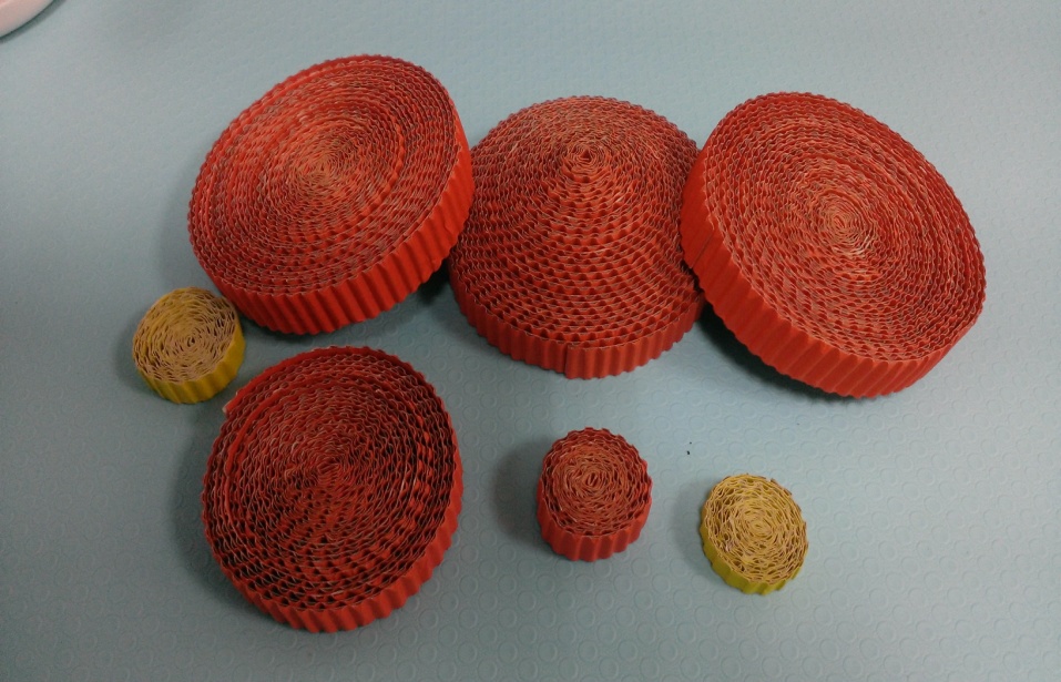 (2)裁剪——根据设计选择瓦楞纸,并将瓦楞纸裁剪成一厘米的长条,有的部分可能会要裁剪成0.5厘米的长条;