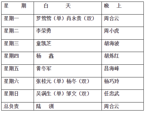 2016年下学期第14周工作安排 来源: 发布时间:2016-11-28 17:27:00 浏览次数: 次 【字体:小 大】 第14周工作安排:11月28日星期一:本周敬业杯比赛;下午年级组长会11月29日星期二:下午“两学一做”学习教育第四次学习讨论支部会议;党支部委员换届选举11月30日星期三:下午教研活动12月1日星期四:下午教研活动12月2日星期五:上 课12月3日星期六:休 息12月4日星期日:休 息 行政值日: 总值日:黄 佳 分享到: 【打印正文】