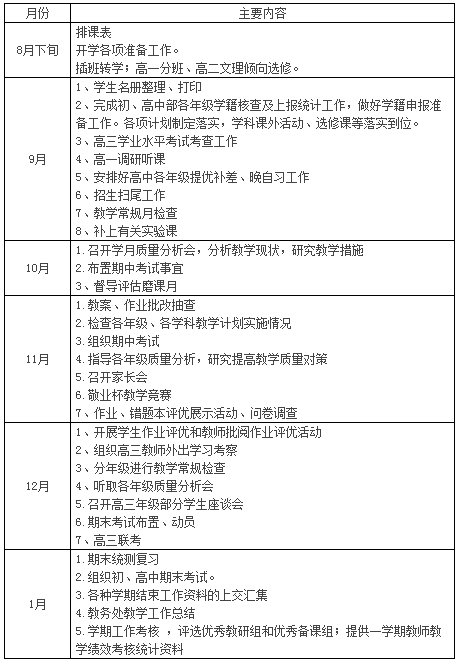 (1)认真落实学校工作要点中提出的各年级工作重点。高一初一年级的重点是“树理想、打基础、养习惯”,要重视基础知识的落实和学习习惯的培养;高二年级初二年级的重点是“树信心、抓落实、勇创新”,通过培优补差,促进学生均衡发展,使学困生树立学习信心,防止出现异常分化;高三年级初三年级的重点是“明目标、善调节、敢拼搏”,要加强对分层次教学和导师制的研究,讲求实效。