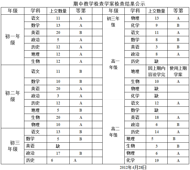 教务处已经将学案检查结果公示三天,部分学科补交了学案,下表为期中学案检查最终稿。学校将以此为依据发放期中学案奖励。请老师们查对。