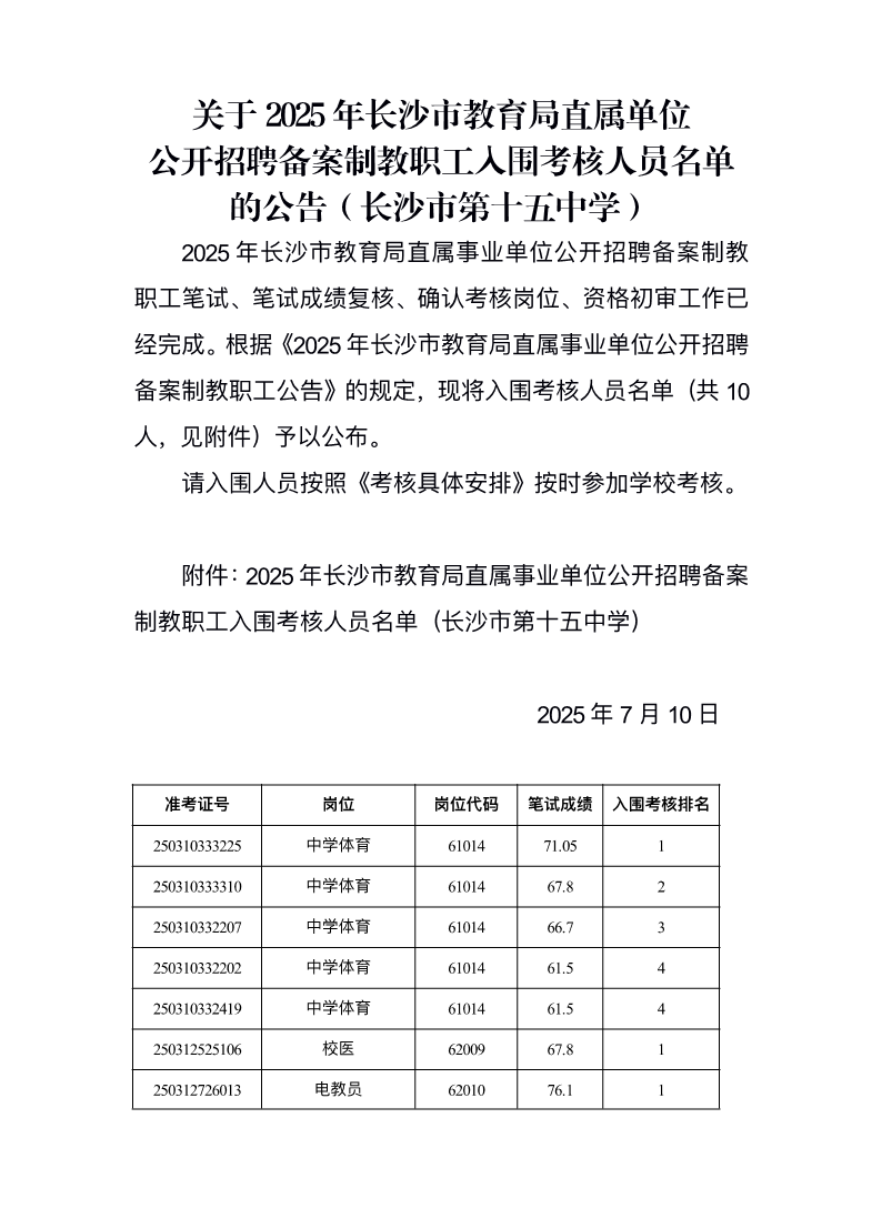 关于2025年长沙市教育局直属单位 公开招聘备案制教职工入围考核人员名单的公告 来源: 发布时间:2025-07-10 16:04:18 浏览次数: 次 【字体:小 大】 终审:swzxw 分享到: 【打印正文】