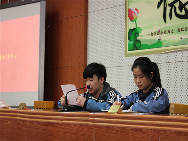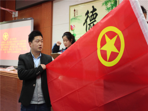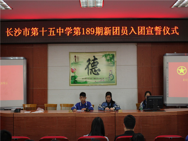 仪式在庄严的国歌声下拉开了序幕。首先由往届优秀团员代表甘浩志同学进行发言,他的话热情洋溢,使出席的所有新团员备受鼓舞。刘珍荣老师代表团委宣布新团员名单,在团委杨书记为新团员代表佩戴团徽后,团委王雅萱同学带领新团员在团旗下进行庄严的宣誓。