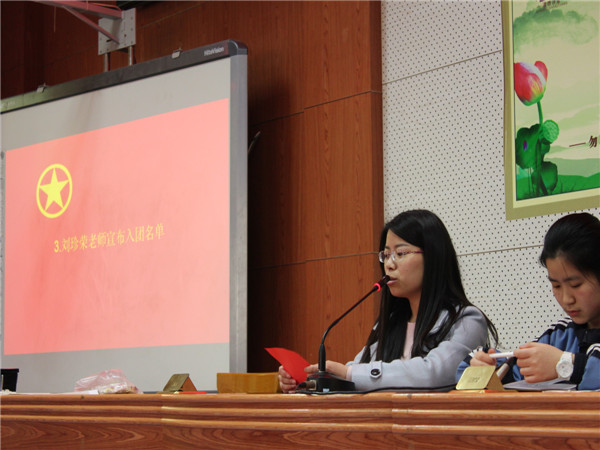 校团委杨书记向各位新团员表示了热烈的祝贺的和诚挚的欢迎。他说,加入团组织是人生的新起点,希望同学们不仅在形式上入团,更要在思想上入团,今后要更加严格要求自己,严格遵守团章,履行团员义务,时时处处起模范带头作用。