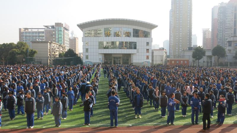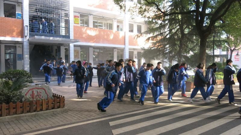 上午10:00,教学楼上空响起的一阵刺耳的警报铃声,南、北栋教学楼楼下浓烟滚滚,安全疏散演练活动拉开了帷幕。各班学生在班主任及任课老师的指引下,迅速离开教室,按照疏散路线,有序地疏散至操场。短短几分钟,全校两千多师生全部安全撤离到操场。
