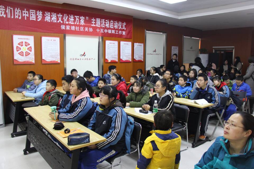为弘扬传统文化,丰富寒假生活,2018年2月2日,6163银河银辉工作室联合侯家塘社区关协在侯家塘社区三楼多功能厅联合举办了侯家塘社区中小学生寒假社会实践活动暨“我们的中国梦,湖湘文化进万家”主题活动启动仪式。学校在职语文教师、雨花区人大代表谢莉、退休资深音乐教师李小明为社区的学生和家长送上了一堂底蕴深厚的国学知识及生动有趣的传统戏曲鉴赏课。本次活动学校党委书记陆洲、校党委专干向艳梅、侯家塘社区党委书记周湘玉、社区党委副书记李婧亲临本次活动现场。