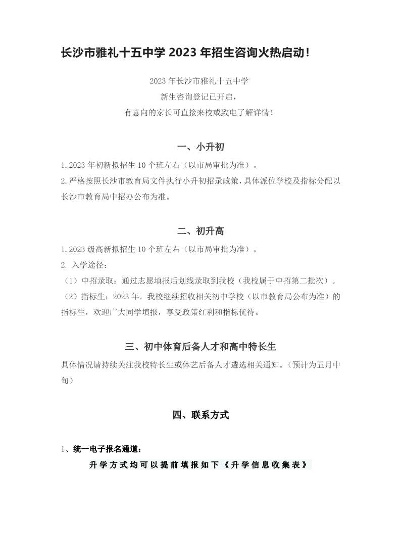 长沙市雅礼十五中学2023年招生咨询通道已开通!